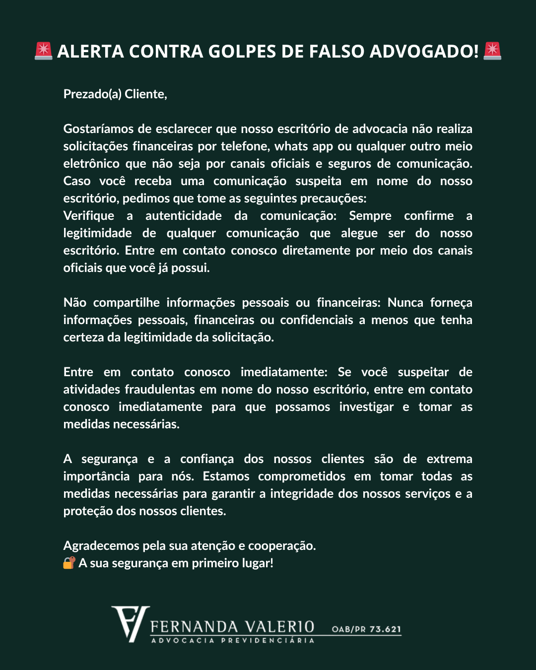 A nobre Advogada Fernanda Valério é uma especialista na área do Direito Previdenciário. Minha familia foi muito bem recepcionada e atendida pela causídica. Em especial minha mãe teve a sua demanda atendida. Ainda existe os remanescentes, assim como os bons profissionais e a Drª Fernanda é uma delas.